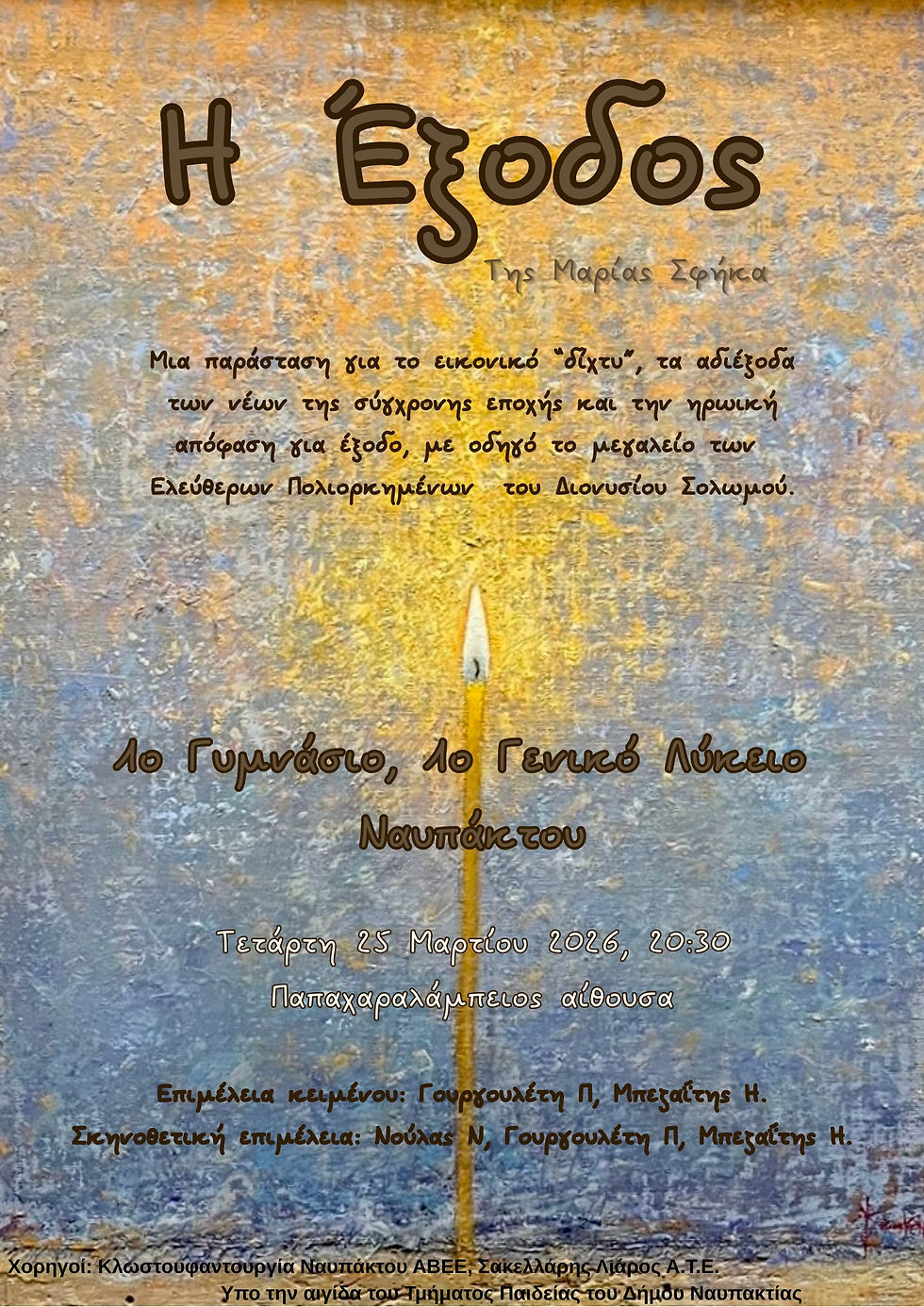 Το 1ο Γυμνάσιο και το 1ο Λύκειο Ναυπάκτου, τιμώντας τα 200 χρόνια από την ηρωική έξοδο του Μεσολογγίου, παρουσίασαν, την Τετάρτη, 25 Μαρτίου, στην κατάμεστη Παπαχαραλάμπειο Αίθουσα Ναυπάκτου, τη θεατρική παράσταση «Η Έξοδος» της Μαρίας Σφήκα. Μέσα από το κείμενο, τη σκηνική παρουσία, το φως, τον ήχο και τη μουσική αναδείχθηκε το μεγαλείο της θυσίας των «Ελεύθερων Πολιορκημένων», σε συνδυασμό με τη σύγχρονη πραγματικότητα, κατά την οποία η νεολαία, στην πλειοψηφία της, είναι αλυσοδεμένη με αλυσίδες, ορατές και αόρατες, εγκλωβισμένη και πολιορκημένη, από έναν αόρατο εχθρό, δημιούργημα της τεχνολογίας. Έναν εχθρό ο οποίος είναι πολύ επικίνδυνος, γιατί ακριβώς είναι αόρατος. Μπροστά σ’ αυτή την απομόνωση και την πολιορκία ο σύγχρονος άνθρωπος επιβάλλεται να κάνει τη δική του Έξοδο και να σπάσει τις σύγχρονες αλυσίδες, που τον αλυσοδένουν.